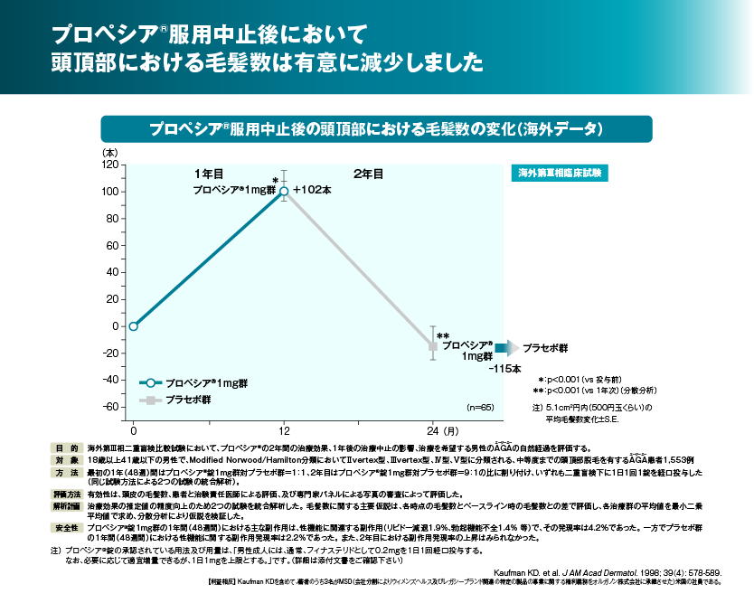 一方、プロペシア®錠1mgを1年服用したのち、服用を中止した症例では、服用中止1年後でプロペシア®服用前の毛髪数まで減少することが確認されています。