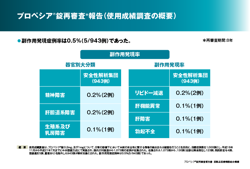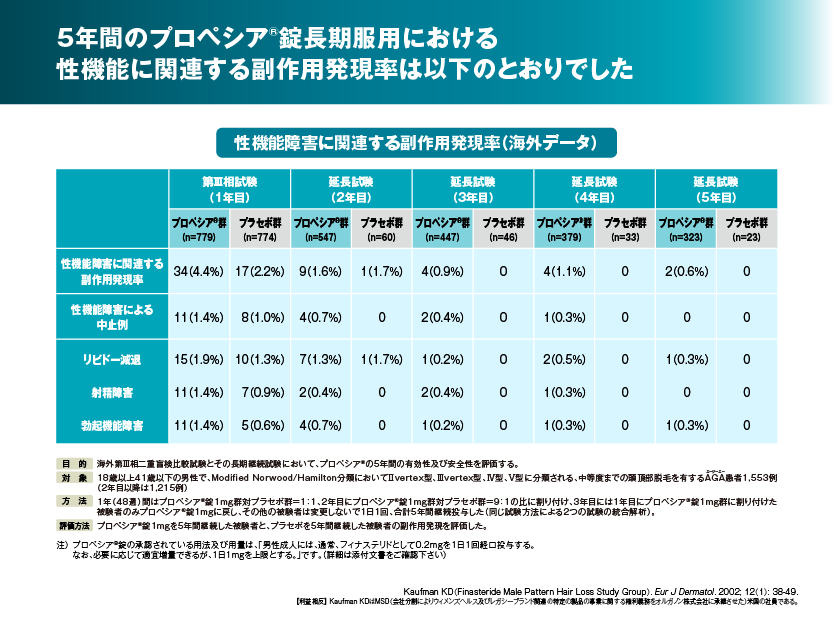 1年間のプラセボを対照とした二重盲検比較試験においては、プロペシア®1mg群(139例)で5%(7例) 0.2mg群(137例)で1.5%(2例) プラセボ群(138例)で2.2%(3例)でした。長期(オープン)試験に移行した後の副作用発現率は1mg→1mgに移行した群(124例)で1.6%(2例)、0.2mg→1mgに移行した群(128例)で0%(0例)、プラセボ→1mg群に移行した群(122例)で1.6%(2例) でした。